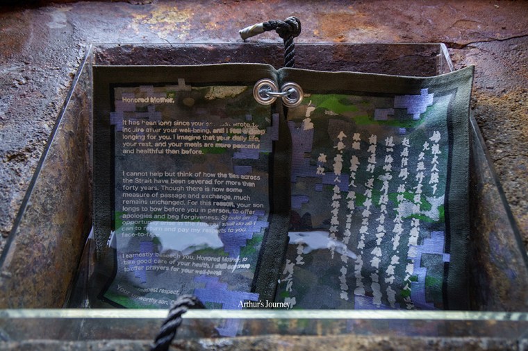 ▲《家書》則在地下碉堡,特別用感濕油墨與滴水的裝置,信件的記憶時而浮現、時而隱沒,記錄過去離散、重聚與戰地生活的心緒。