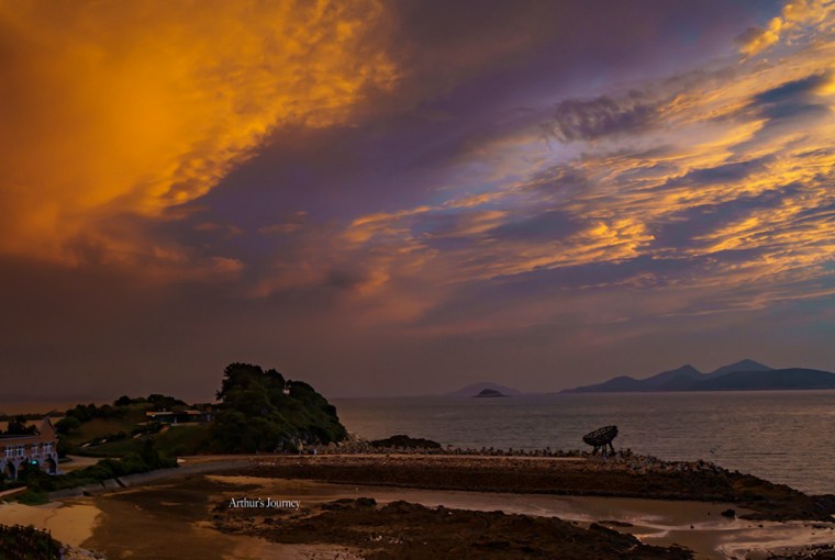夜晚下榻南竿珠螺灣會館,打開窗戶赫見巨形鳥巢立於海角堤岸上,《築巢》,馬祖在地藝術家陳益輝以島上反登陸的軌條砦為素材創作的藝術島作品,軌條砦原本不屬於島上的物件,反登陸的功能,同時也阻絕小島原本就極其有限的發展可能性,這件作品象徵生命的韌性與面對挑戰的本能,無論面對何種挫折都如同鳥巢般,完成生命的華麗轉身。翌日天未亮即醒來,窗外已默默上演著夢幻般的景緻,黎明中絢爛的光影不斷變幻映照海角一隅的鳥巢,瞬時皆為永恆。