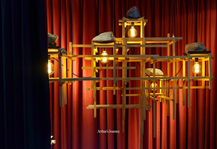 兩位來自日本的藝術家米谷健與茱莉亞,他們長年關注生態議題,整件作品用了上千條釣魚線與魚珠交織而成,搭配紫外線燈光,讓整個空間如夢境一般。複雜的魚線網絡,象徵大海中生命體彼此依存。