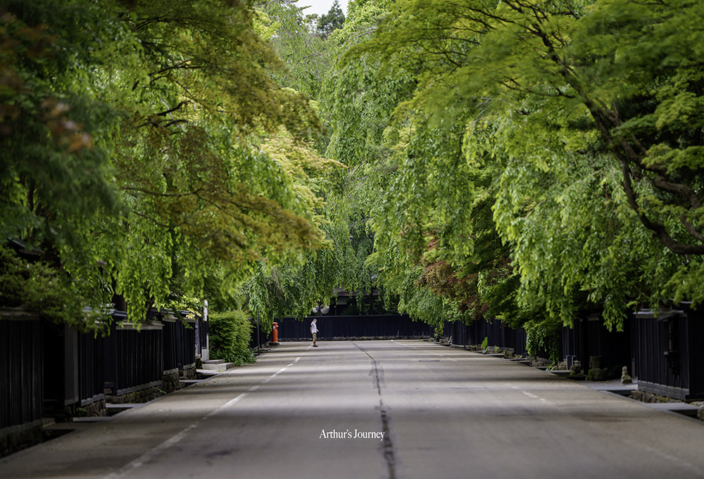 初訪角館彼時正值初夏,氣溫怡人,這裡依然保存著許多江戶時代武家宅邸,武家屋敷小路兩旁林木往路中生長,綠意盎然,不是旅遊旺季來訪,路上人車稀少,在綠色隧道中散步非常舒適愜意,枝垂櫻和楓樹從道路兩側厚重黑色板牆探出頭來,甚是特別,不像一般路樹植栽在道路兩旁,這裡的樹都住在深邃的宅第院落之內,被厚重綿長的圍牆環繞,在棋盤式的街道與世俗畫下彊界,承襲數百年的格局風韻,柔美與秩序兼具,被人們稱作「陸奧小京都」。