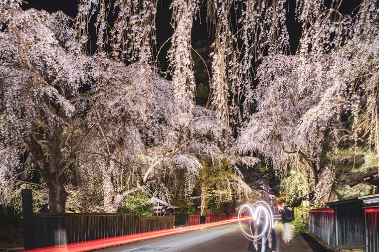 我們在遊客尚未湧入的清晨就走進武家屋敷小路上,春寒料峭的冷冽空氣中格外清新,欣賞老宅院內靜靜綻放的垂枝櫻,百年老樹粗黑的枝幹各具姿態,花朵在纖細柳條上婀娜伸展,輕柔地懸垂在兩側黑色板牆和古老的門扉旁,我們捕捉穿過武家屋敷武士老宅的第一道曙光,陽光穿透細緻花朵的瞬間光影更顯夢幻,枝垂櫻的花朵雅致輕盈,很適合清晨逆光拍攝,而關於角館來自京都公主與枝垂櫻的敘事,也許摻雜著許多一廂情願的浪漫想像,不過會讓我們按下的每一個快門感覺更有溫度,彷彿從花穗閃爍的光影中穿梭時空,在這樣充滿思念的櫻花樹下,妳會不會想起誰?